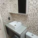 Banheiro social com pastilhas e gabinete de pia,