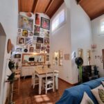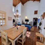 Sala de jantar e estar com pé direito alto e forro de madeira,