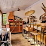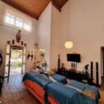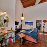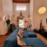 Sala de jantar e estar com pé direito alto e forro de madeira,