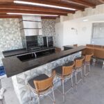 Área gourmet com cozinha, churrasqueira e piscina aquecida,